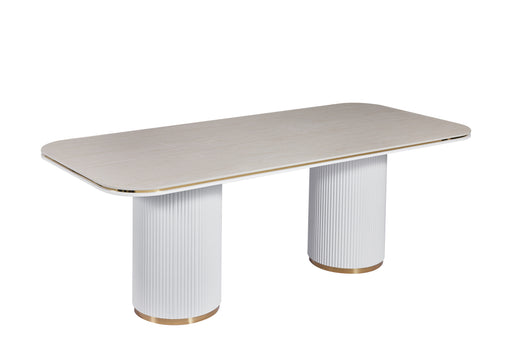 FBM MeubelenDe Pradino Ivory Signature Eettafel is een ware blikvanger die lichte elegantie en luxueus design samenbrengt. Het verfijnde travertin kera...
